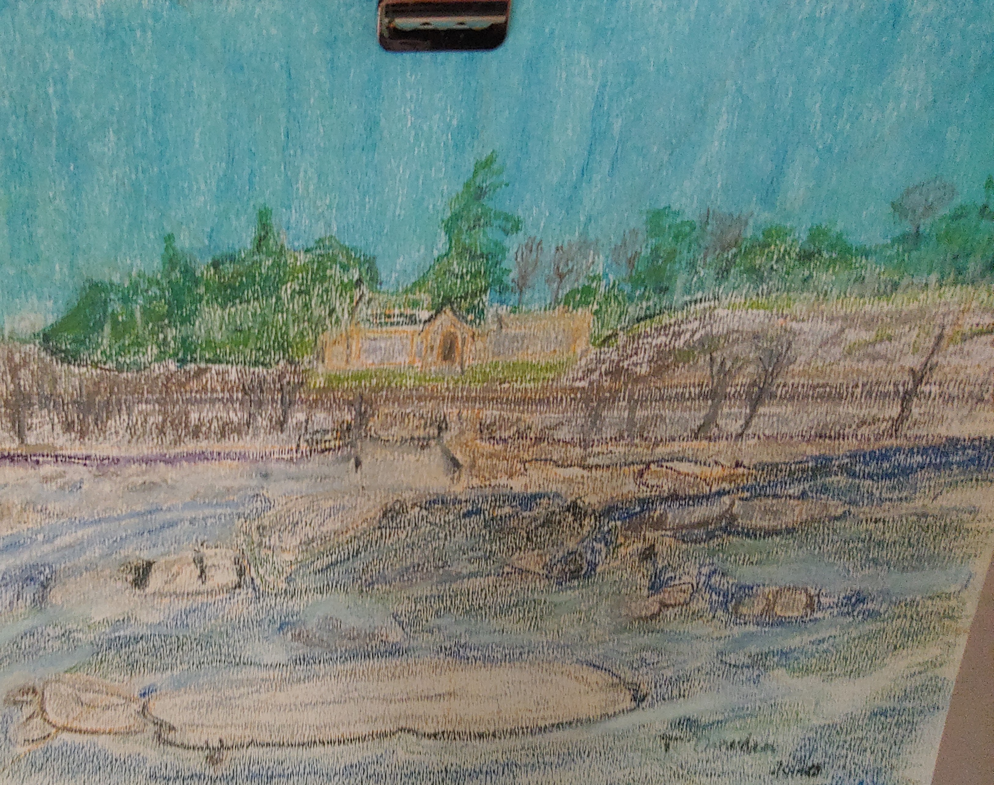As you may know, my hometown of Richmond was founded at the Fall Line of the James River. Millenia ago, geological forces operating on a line of limestone, running from Georgia through Pennsylvania and beyond, caused huge blocks of this limestone to push up to the surface, especially in the river bed of what became the James River. These limestone boulders form a barrier to boat traffic on the James and mark the furthest point west that large vessels could navigate upriver from the Ocean and the Bay. Today Richmond straddles both sides of the James as indicated by this work. The view is of the mausoleum in Hollywood Cemetery on the north bank from Belle Isle adjacent to the south bank. TO