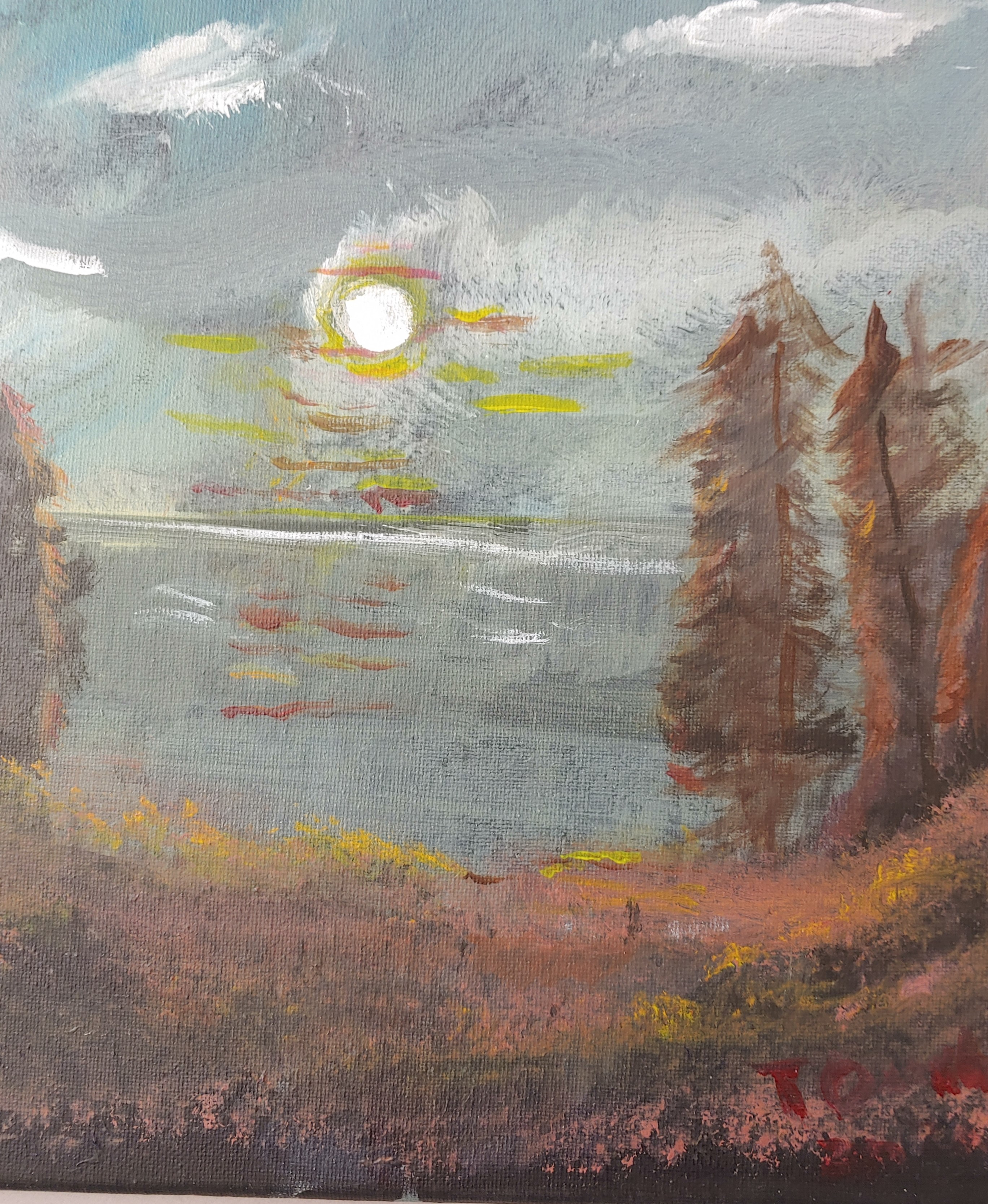 A “black canvass” following Bob Ross’ model and which turned out pretty well. The more I look at this painting the more it reminds me of the Hudson River school of artists who were active around the end of the 19th century and are best known for the use of natural light(luminescence) in their paintings. TO